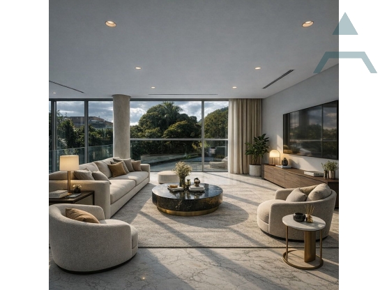 Apartamento de 445 m² (410 m² + maletero + cuarto de chofer), con 3 habitaciones, 3.5 baños, 2 cuartos de servicio con 1 baño, y 5 puestos de estacionamiento. Amplios espacios, excelente distribución y gran potencial.